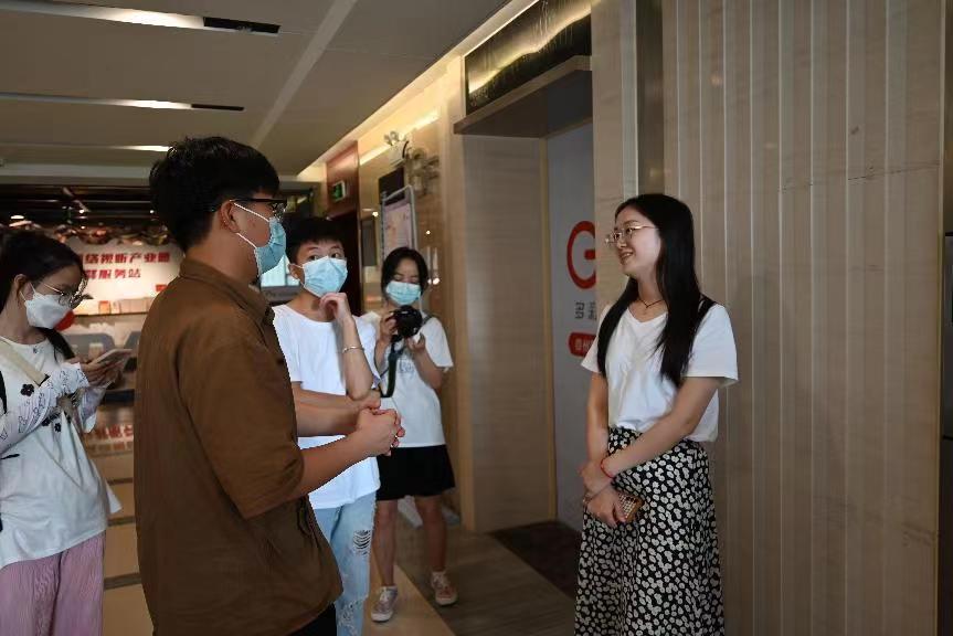 随后,王堃老师带领学生们先后参观了公司的办公区、产品区以及视听产业园区,为大家介绍了各部门的主要职能和工作内容。参观过程中,学生们不时与王堃老师进行交流互动,就“电视媒体的创新”等话题进行了热烈讨论。