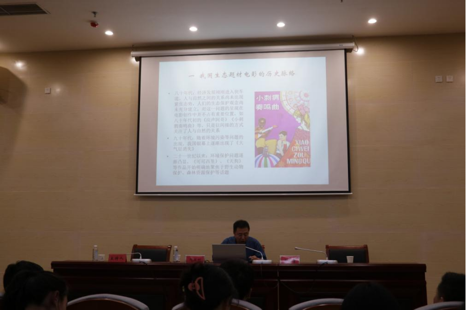 邱振刚以生态题材电影为背景,以不同时代为时间线,讲述人们的生态观念从模糊的生态防护到聚焦生态保护转变的过程。随后,他以《可可西里》、《天狗》等电影为例进行了分析阐释。邱振刚还就当下生态题材影片的创作困境、市场前景等作了深入的分析。